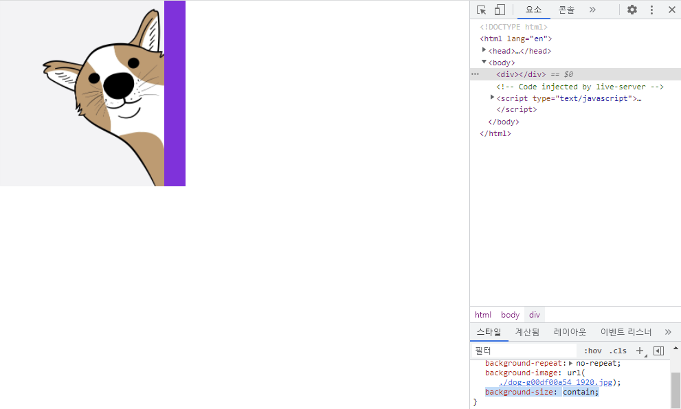 ▶ background-size: contain; => 전체 이미지가 잘리지 않고 박스 안에 모두 들어가게끔 해준다.